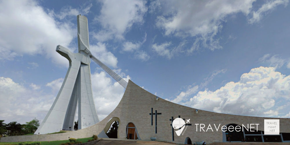 巨大な十字架をモチーフにした近代建築で、外壁の多くがガラス張りという非常にユニークなデザインが特徴。伝統的な教会建築とは一線を画し、「近代アフリカ建築の象徴」ともいわれています。
