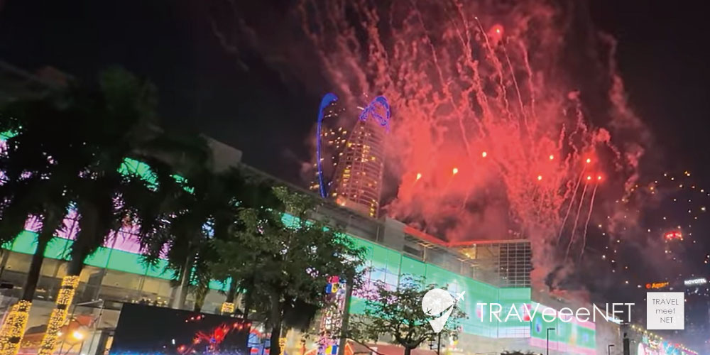巨大スクリーン、ライブパフォーマンス、DJイベントで盛り上がり、カウントダウン時には花火と光の演出が会場を包み込みます。市内中心部に位置するためアクセス抜群。