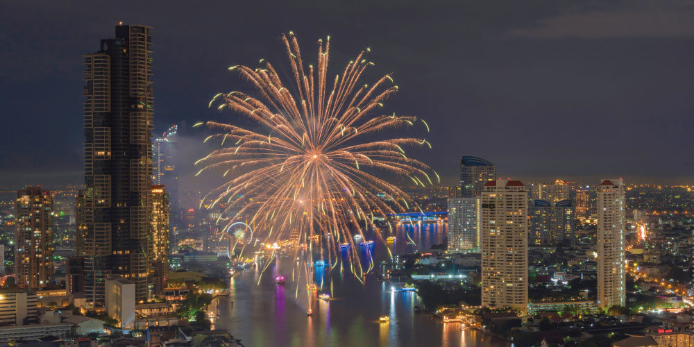 リバーサイドやルーフトップバーからの夜景と花火の組み合わせは、バンコクならではの特別な体験。
