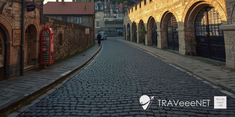 修道院へ続く参道には、石畳の坂道と城壁に囲まれた中世の街並みが残っています。