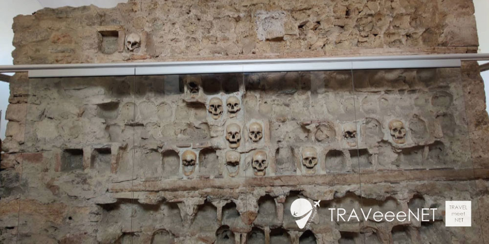 高さ約4.5mの塔には、かつて952個の頭蓋骨が埋め込まれていたとされ、現在も数百個が残されています。