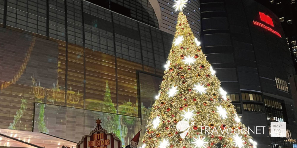 ソウル東部にそびえるランドマーク「ロッテワールドタワー」は、123階建ての韓国一高い建物。その周辺一帯は年末になると豪華なイルミネーションや巨大クリスマスツリーが登場し、観光客に大人気です。