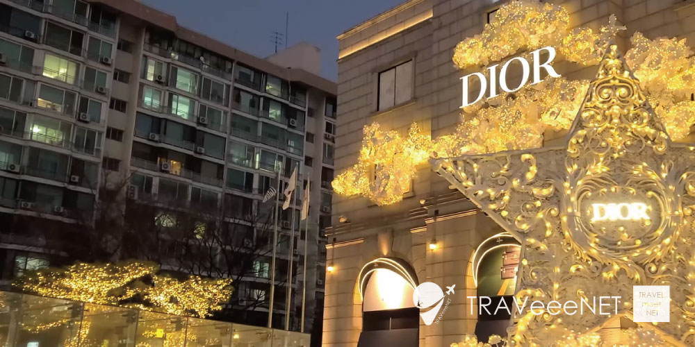 「ソウルのおしゃれエリア」として知られる狎鴎亭ロデオ通り。高級ブランドショップやおしゃれなカフェが並び、クリスマスの季節には上品で落ち着いたイルミネーションが街を彩ります。